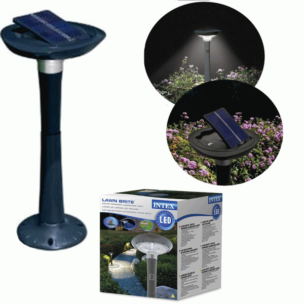 Umweltfreunde Intex Lawn Brite Solar-LED-Leuchte bringt Schönheit. Sicherheit und Wert für jedes Heim. Umweltfreundliches. langlebiges Solarpanel das die Leuchte auch im Stil hat. mit einem wiederaufladbaren Lithium-Ionen-Akku. LEDs bieten langlebige Beleuchtung. ohne ständiges wechseln der Glühbirnen. Jede Leuchte besteht aus zwei Basiseinheiten Einstellbares Solarpanel erlaubt der Lampe das meiste Sonnenlicht während des Tages zu absorbieren. verstärkte Beleuchtung in der Nacht auch der obere Stil ist beleuchtet. Intex Lawn Brite Solar-LED Licht wird mit Netzschalter Funktion. USB-Ladekabel und Kompass. um die Positionierung zu unterstützen ausgestattet.