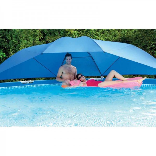 Schwimmbad-Sonnenschirm für Ihre Sommeroase Zuhause! Mit diesem Schwimmbad-Sonnenschirm können Sie Ihren Pool jetzt noch mehr genießen. da Sie herrlich im Schatten liegen und keinen Sonnenbrand bekommen! Durch diesen Schirm haben Sie keine Last mehr von warmen Sonnenstrahlen. während Sie das Wasser in vollen Zügen genießen. Der Sonnenschirm wird an vier Punkten einfach an Ihrem Pool befestigt. So erhalten Sie einen großzügigen angenehmen Platz im Schatten. Der Sonnenschirm kann zusammengeklappt werden und lässt sich daher einfach verstauen. Der Schirm besteht aus stabilen Glasfaserstangen und das Tuch aus starkem gewebtem Dacron Polyester. Dieser Sonnenschirm ist nur für runde Pools mit einem Durchmesser von 366 cm bis 549 cm geeignet: Metal Frame Pool Ø 366 Metal Frame Pool Ø 457 Metal Frame Pool Ø 549 Metal Frame Pool Ø 732 Ultra Frame Pool Ø 427 Ultra Frame Pool Ø 488 Ultra Frame Pool Ø 549 Eigenschaften: Einfache Befestigung an 4 Punkten des Pools Zusammenklappbar • Glasfaserstangen Stabiles. gewebtes Dacron Polyester Farbe: Blau Für RUNDEN Ultra Frame Pool von Ø 427 bis Ø 549 cm geeignet Für RUNDEN Metal Frame Pool von Ø 366 bis Ø 732 cm geeignet