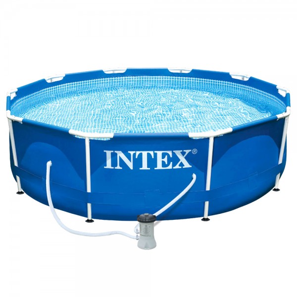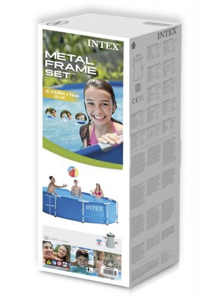 INTEX Frame Pool Swimming Pool ohne Pumpe 305x76cm Schwimmbecken Stahlrohrbecken mit der schwächsten Pumpe von INTEX INTEX-Art.nr.: 28202GN Beschreibung: INTEX Metal Frame Swimming Pool (305x76cm) Mit diesem Pool der Marke INTEX sorgen Sie an heißen Sommertagen für die nötige Abkühlung. Der Aufbau ist im Nu ohne Werkzeug durch einfaches zusammenstecken der Rohre erledigt. Durch die verzinkte und pulverbeschichtete Stahlrohrkonstruktion und die verstärkten Seitenwände ist der Pool sehr Standfest und für eine hohe Beanspruchung optimal geeignet. Ob für die Kinder zum Planschen. Wasserspielen oder für die Erwachsenen zum Entspannen. Mit diesem Pool steht einem Badespaß an einem schönen Sommertage nix mehr im Wege. Eigenschaften: INTEX Metal Frame Swimming Pool Stahlrohrbecken – Rahmenkonstruktion besteht aus massiven. verzinkten Stahlrohren die Rahmenkonstruktion bietet eine hohe Stabilität und Standfestigkeit Maße: 305cm Durchmesser. Höhe 76 cm Wasserinhalt (bei 90% Befüllung): ca. 4.485 Liter inkl. Filterpumpe (Art. 28602GS): ca. 1.250 Liter/Stunde inkl. Filterkartusche für Filterpumpe: Typ H (Art. 29007) Spezialventil für einfaches Ablassen des Wassers 3-fach verstärktes Material der Seitenwände schneller und einfacher Aufbau. bereit zum Befüllen in 30 Minuten Warnhinweise: Achtung! Nur unter Aufsicht von Erwachsenen verwenden. Vorteile dieses Pools: Qualitätsprodukt von Intex 3 – lagiger Aufbau des Super-Tough Materials garantiert Stärke und Haltbarkeit ein praktisches Ablassventil kann mit dem Gartenschlauch verbunden werden. damit das Wasser am gewünschtem Ort abgelassen werden kann in 30 Minuten ist der Pool bereit zum Befüllen Filterpumpe: Die Filterpumpe sorgt für eine sehr gute Filterung und bildet die Basis für sauberes Wasser.