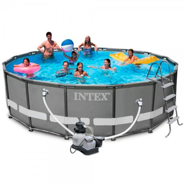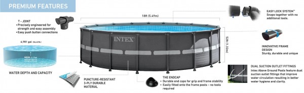 Die Seitenwände sind aus einem neu entwickelten. dreifach verstärkten. Super Tough- Material gefertigt. Die durchdachte Konstruktion des Beckens erlaubt einen schnellen und einfachen Zusammenbau. Technische Daten: Wasser Kapazität: 26423 Liter Sandfilter 5000- 6000 Liter / Stunde 220-240 V Maße: 549 cm Durchmesser. Höhe: 132cm FI-Schutzstecker empfohlen (nicht im Lieferumfang enthalten) Lieferumfang: – Intex Ultra Frame Pool – Sandfilteranlage 56674 – Schlauchverbindungen – Leiter –