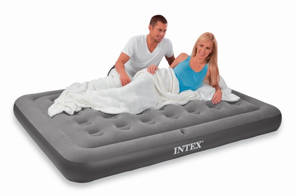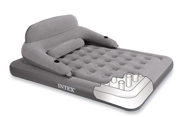 INTEX Luftbett Lounge Gray 203 V Abmessungen: 203 x 152 x 71 cm (L x B x H) 0.53 mm qualitätsgeprüfte. wasserfeste. beflockte Oberseite 0.38 mm Vinyl Seitenwand und Boden 48 cm hohe Rückenlehne elektrische Luftpumpe 3-in-1-Ventil im Luftbett mit extraweiten Öffnungen XXL Ventil in der Rücklehne Befestigung der Rückenlehne mit Schnellverschlüssen 2 Getränkehalter für Erfrischungen inklusive Tragetasche