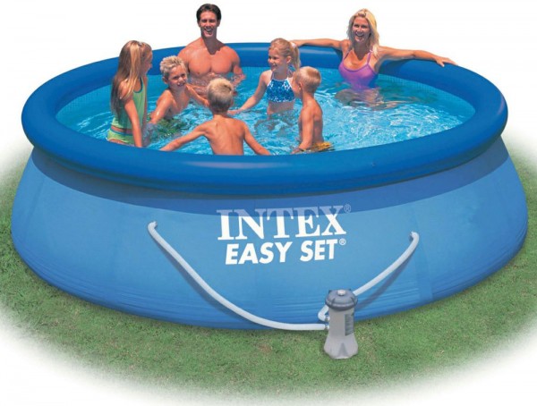 INTEX 28142GN Easy-Set Pool. 396×84 cm Swimmingpool. Schwimmbecken mit Pumpe Easy-Set Pool. 396×84 cm Swimmingpool. Schwimmbecken. Planschbecken. Quick Up. inklusive Filterpumpe Hersteller: Intex Pools Artikel-Nr.: 28142GN Hersteller Art.Nr.: 28142GN Liter 18500 Produktbeschreibung Produktbeschreibung Einfachster Aufbau: – In 10 Minuten bereit zum Befüllen – Leeren Pool ausbreiten. äußeren blauen Ring aufpumpen und dann mit Wasser befüllen – Der Pool stellt sich mit zunehmenden Wasserstand selbstständig auf – Werkzeug wird nicht benötigt. Pool: – 3-lagiger Aufbau mit SUPER-TOUGH™ Material – Äußere Schicht besteht aus festem und belastbarem PVC – Innere Schicht besteht aus einem überlappenden Polyester-Mix für besseren Halt beim Baden im Pool – Patentierte Verklebung von Pool und Beckenrand – Enthält ein Ablassventil für den Anschluss eines Gartenschlauchs. um Wasser außerhalb des Pools ablassen zu können Filterpumpe: – Einfache Reinigung: Kann mit Gartenschlauch ausgewaschen werden – INTEX 28604GS – Pumpleistung: 2.271 l/h – Stromanschluss: 230/12 Volt. 60 Watt. 0.30 Ampere – Durchmesser Schlauch-Anschluss: 32 mm – Inkl. auswechselbarer Filterkartusche Typ A