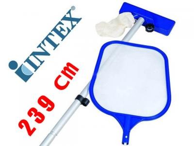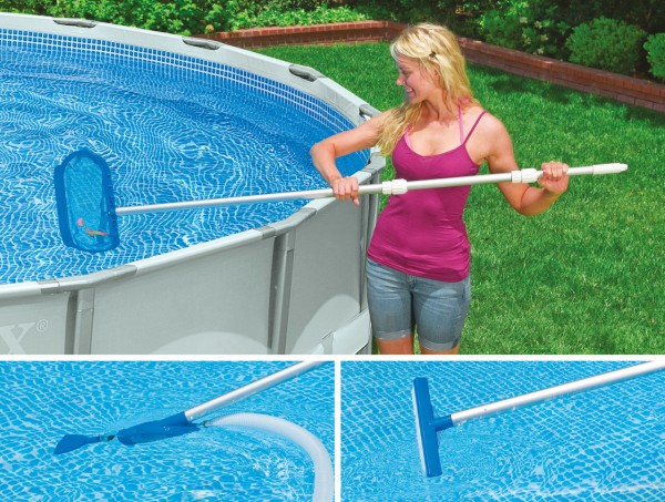INTEX Skimmer Pool Reinigungsset   Reiniger Bodensauger Kescher   Teleskopstange   Ideales Reinigungsset gerade auch für große Pools Mit dem verstellbaren Teleskop Handskimmer erreichen Sie auch Schmutzpartikel weit im Pool Inneren. Der mitgelieferte Bodensauger ist ideal zum Reinigen des Poolbodens. Hier kann sich nach einiger Zeit ein glitschiger Algenbelag bilden. Sie spülen über den angesteckten Gartenschlauch des Saugers das gelöste Material sofort ab. Die weggespülten Schmutzpartikel landen somit in einem Reinigingsbeutel. der bequem ausgeleert und gereinigt werden kann.   Komplett Reinigungsset bestehend aus: – Teleskopstange bis 239 cm – Handskimmer – Bodensauger unbahängig von der Pumpenleistung der Filterpumpe verwendbar.