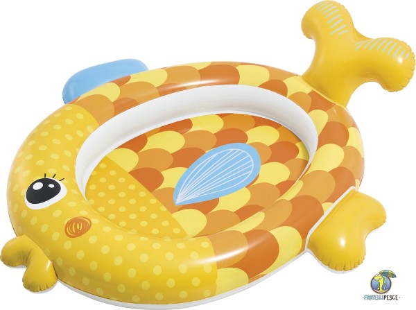 Intex Friendly Goldfish baby zwembad 140 x 124 x 34 cm         Intex Friendly Goldfish baby zwembad 140 x 124 x 34 cm Intex Baby Pool Friendly Goldfish is een baby zwembad in de vorm van een vis. De overheersende kleur van het bad is oranje/geel. Dit opblaasbare babybadje is erg leuk om naar te kijken en om in te spelen. Aan de buitenkant van het bad zitten twee vinnen. een staartje en het mondje van de vis. Je baby of kind voelt zich meteen thuis door de vriendelijke uitstraling van het bad. Het badje is ideaal om je baby verkoeling te geven in de zomer. Daarbij beleeft je baby ook nog eens een hoop lol. Is het de eerste keer dat je baby in het water gaat spelen? Dan is dit een prima instapmodel. Laat je baby nooit alleen achter in het zwembad. Maar dat lijkt me vanzelfsprekend 😉