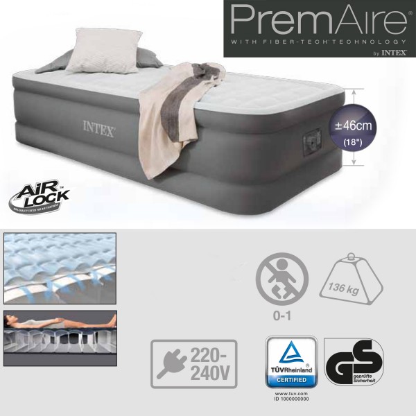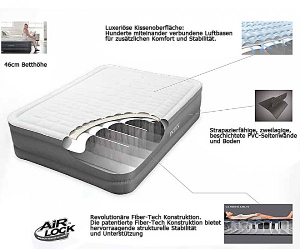 INTEX Luftbett der Königsklasse neue Technologie 2017! Die neue Linie der aufblasbare Betten Intex übertrifft alle Erwartungen! Jetzt können wir mit Sicherheit sagen. dass die aufblasbare Bett manchmal stärker und bequem! Neue aufblasbare Bett Intex PremAire zu Ihrem Lieblingsraum. wo Sie aufwachen jeden Tag gut gelaunt. und vor allem ausgeruht und mit Energie für den ganzen Tag in Rechnung! Dank der neuen Technologie wird das Bett die Position des Körpers. um Ihre bevorzugte Steifigkeit eingestellt. die Ihren Traum zu einem angenehmen und sehr komfortabel machen werden sich erinnern. von der Firma Die Technologie „PremAire“ im Jahr 2015 Intex vereint die Technologie Intex wie DuraBeam. Fiber-Tech und andere. ausgezeichnete Durchstoßfestigkeit und Haltbarkeit zweischichtige laminierte Seitenwänden und am Boden des Bettes. Der innere Aufbau des Bettes besteht aus Tausenden von Fasern. so dass das Bett fester und haltbarer. Die obere Schicht des Bettes. der Hunderte von Lufttaschen wird ermöglichen. dass Luft über die Oberfläche zirkuliert. wodurch eine formschlüssige Komfort. Abdecken die Betten sehr komfortabel. Dicke 0.53 mm. ähnlich wie Velours. Diese Abdeckung nicht geben Bettwäsche zerknüllt oder Rutsche. Schnelle Pump oder laden Sie ein aufblasbares Bett bietet eine integrierte elektrische Pumpe 220. – Built-in elektrische Pumpe 220; – Organisation und Durchführung und Lagerung – Benutzerhandbuch in Deutsch – Patch für die Reparatur von Pannen. Intex 64472 Eigenschaften: Einbauelektro 220V Pumpe: . einen integrierten Elektropumpe 220V Größe: . 99-191-46 cm Gewicht: 7.3 Kg Hersteller: Intex