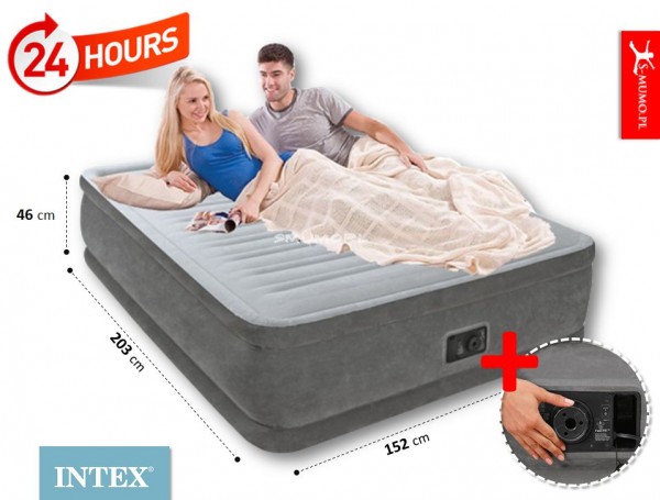 Die Intex-Luftbetten mit der innovativen und patentierten Dura-Beam Technologie verfügen über tausende hochfeste Polyesterfasern     Anders als bei herkömmlichen Luftbett-Konstruktionen dehnen sich diese selbst infolge langjähriger Beanspruchung nicht aus und gewährleisten so eine erstaunliche Langlebigkeit und einen lang anhaltenden Liegekomfort. Die innere Dura-Beam Technologie sorgt für eine optimale Stabilität und dadurch für einen hervorragenden Komfort und einen erholsamen Schlaf.  Das Bett verfügt über eine weiche Beflockung für einen besonderen Komfort. die horizontalen Luftkammern gewährleisten zusätzliche Stabilität. Durch das eingelagerte Kissen ist dieses Luftbett ideal für den täglichen Gebrauch im Haus und im Freien. Für zusätzlichen Komfort verfügt dieses Bett über eine leistungsstarke elektrische Pumpe für ein schnelles Aufpumpen und Entleeren.           Features :  – Qualitätsgeprüftes Material und wasserdichte Beschichtung – DURA-BEAMTM Konstruktion – Erhöhtes Luftbett – Integrierte elektrische Pumpe – Zusammenfaltbar – platzsparende Aufbewahrung und Transport – Inklusive Tragetasche – Ist aufgrund der Hochleistungspumpe in nur 4 Minuten aufgepumpt! – Masse Luftbett: 152 x 203 x 46 cm cm – Gewicht: 19 Kg – Farbe: Grau Zusammenfassung :  – 100% Originalware – Original verpackt – TOP-Ware zum kleinem Preis – Ware TÜV geprüft und mit CE-Kennzeichnung – volle 12  Monate Herstellergarantie