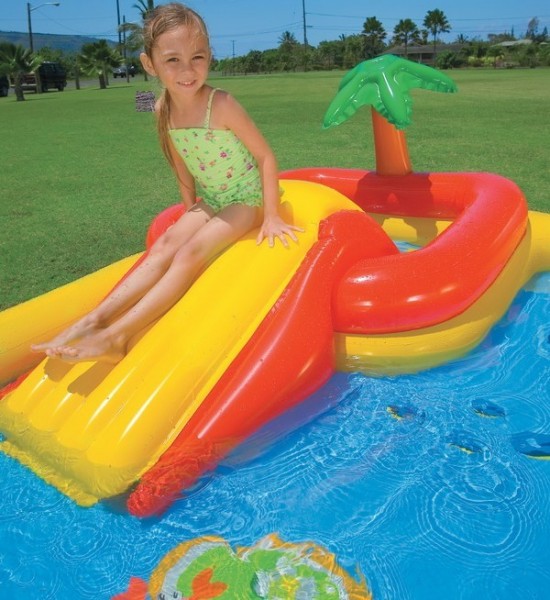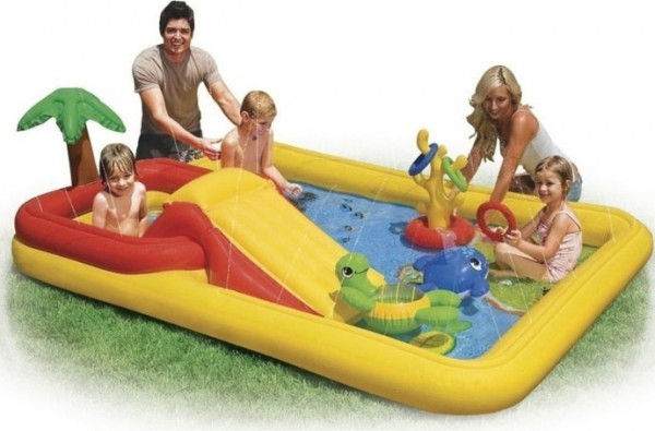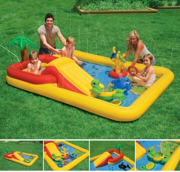 INTEX Planschbecken Playcenter Ocean Play 57454 Maße: ca. 254x 196 x 79cm. zwei Pools in einem. mit Wasserrutsche und umfangreichen Spielmöglichkeiten Lieferzeit: 1-3 Werktage Beschreibung Planschbecken Playcenter Ocean Play: Für Kinder ab 3 Jahren geeignet für kleine und große Wasserratten geeignet integriert sind 2 Pools zum planschen – 1 großes und 1 kleines aufblasbare Wasserrutsche verbindet beide Becken aufblasbare Palme integriert tolles Meeres-Design am Grund des Bodens. kräftige bunte Farben Beide Becken sind mit Ablaufloch ausgestattet Überlaufloch im großen Becken verhindert einen Wasserspiegel über 11 cm. Wassersprüher am oberen Rand des großen und kleinen Beckens geeignet zum Anschließen des Gartenschlauches inklusive Spielset: Fisch. Kröte. Ringbaum und Ringe ideal für Garten oder Terrasse rundherum mit Sprühring ausgestattet. der mit Wasser gefüllt wird Haltbares Vinyl-Material Wasserkapazität des Hauptbeckens (bei Füllung mit 23cm Wasserhöhe) 458 L mit Reparaturflicken