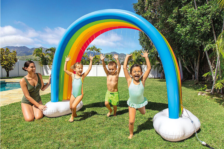 ARTIKELBESCHREIBUNG Erleben Sie unvergesslichen Spaß mit dem coolen INTEX Rainbow Cloud Sprinkler. Der 300 x 109 x 180 cm (L x B x H) große INTEX Rainbow Cloud Sprinkler verfügt über einen Sockel. der mit Wasser gefüllt wird und somit für Stabilität sorgt. Wasser spritzt aus dem Bogen. Perfekt für Sommerpartys. Ab 3 Jahren TECHNISCHEDATEN Größe: 300 x 109 x 180 cm (L x B x H) aufgeblasen Material: Vinyl Materialstärke 0.30 mm Schließen Sie einfach einen Wasserschlauch an die Düse an. und der Spaß kann beginnen Perfekt für Sommerpartys Reparaturflicken Wasser spritzt aus dem Bogen Wassergefüllter Sockel für Stabilität Garantiert viel Spaß und Action Ab 3 Jahren