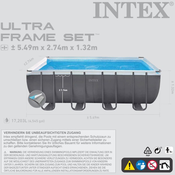 Intex Swimming Pool Frame 549x274x132cm – mit Sicherheits Leiter. ! Artikelbeschreibung Der Ultimative Aufstellpool. Platzsparend. massiv und hochwertig. Seitenwände aus extrem verstärktem SUPER-TOUGH® Material. Die pulverbeschichteten Metall-Seitenstützen sorgen für Stabilität und gewährleisten eine lange Lebensdauer. Einfach ohne Werkzeug zu montieren. Mit diesem 549 x 274 x 132 cm großen Luxuspool