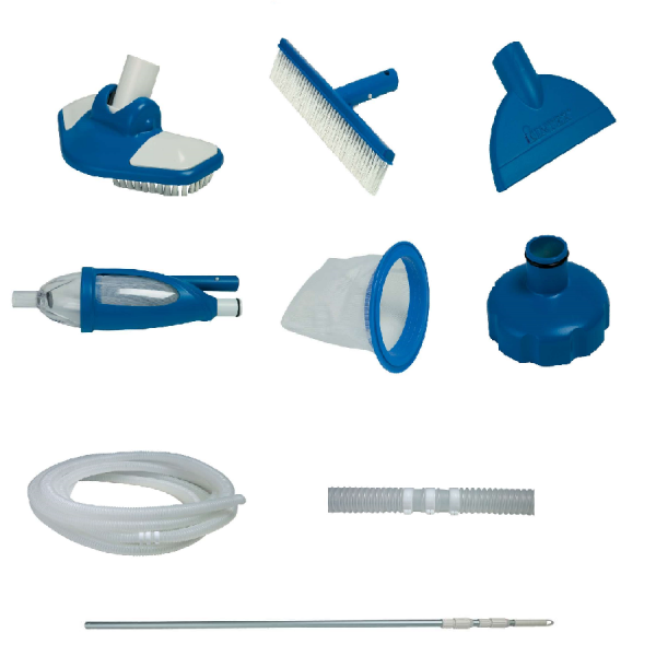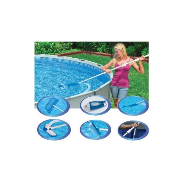 Ideales Reinigungsset für große Pools. Inklusive Teleskopstange aus Aluminium. Benötigt eine Intex Filter- oder Sandfilterpumpe mit einer Mindestduchflussmenge von 3’028 L/h. Vacum saugt Ablagerungen vom Poolboden und durch den Filter. Mit 7.50m Schlauch