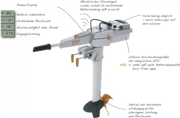 Torqeedo Travel 503S – Elektromotor inkl. Akku Torqeedo Travel 503 /S – Elektromotor inkl. Akku. Bordcomputer mit integriertem GPS Wie ein normaler tragbarer Außenborder – nur komfortabler und sauberer. Mit seiner integrierten Lithium Batterie und seiner überragenden Effizienz ist der Travel die einzige Alternative zu einem kleinen Benzin-Außenborder. Er bietet den gleichen Nutzen und ein paar zusätzliche Vorteile – die wichtigsten finden Sie unter den Hauptmerkmalen in Stichpunkten. Für Beiboote. Dinghies und Daysailer ist der Travel deshalb der perfekte Außenborder. Hauptmerkmale kann das. was ein 2.5 PS Benzin-Außenborder kann. ist aber umweltfreundlicher. leise cool