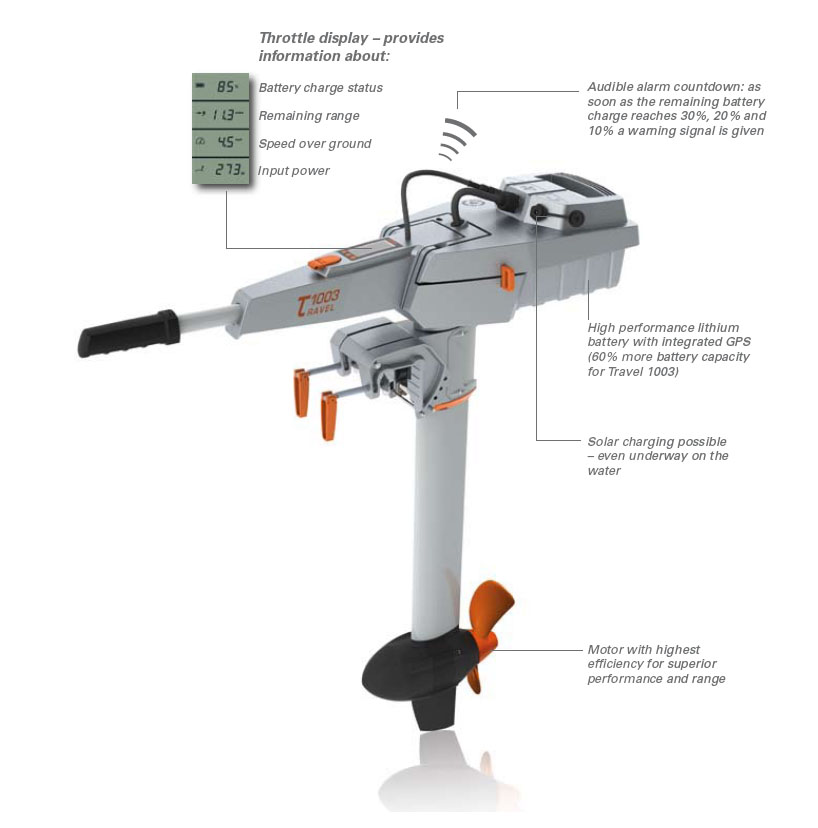 * Die Vortriebsleistung unserer Travel Elektroantriebe ist vergleichbar mit Benzin-Aussenbordern der genannten PS-Leistung.